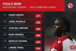 体育资讯5月9日讯 Squawka统计了本赛季欧冠球员被侵犯的次数,并列出榜单,穆西亚拉、贝林厄姆、努诺-门德斯26次被侵犯并列第二多。