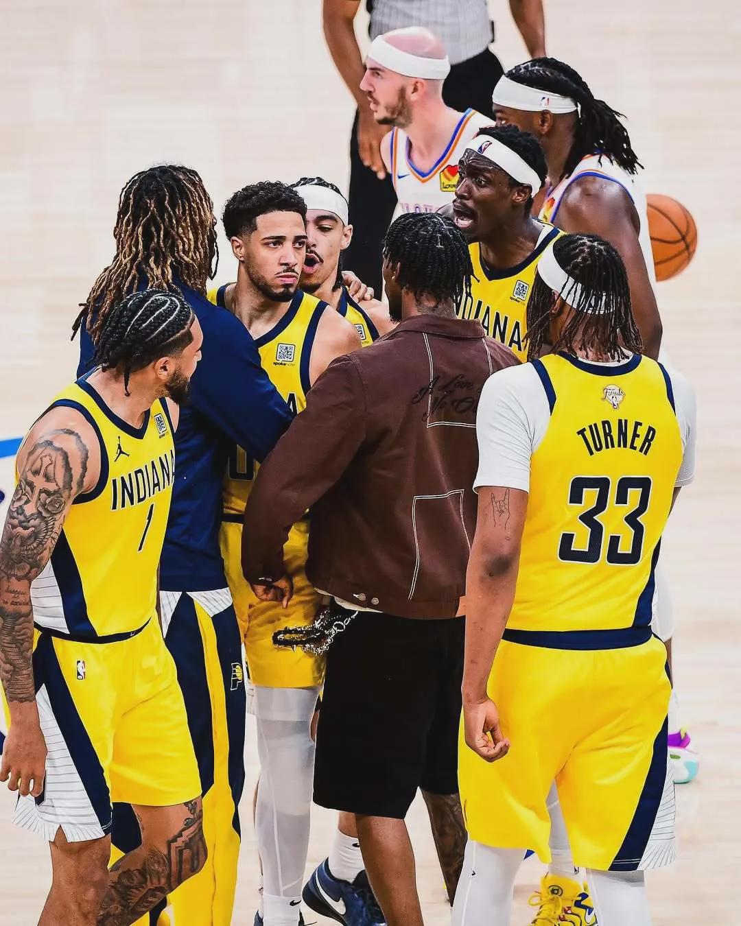 总决赛天王山之战,哈利伯顿首发上场34分钟,投篮6中0,三分4中0,罚球4中4,得到4分7篮板6助攻3失误3犯规,正负值-13全场第二低。他是总决赛史上第一位出战超过30分钟,0进球0抢断0封盖,同时出现3失误3犯规的球员。