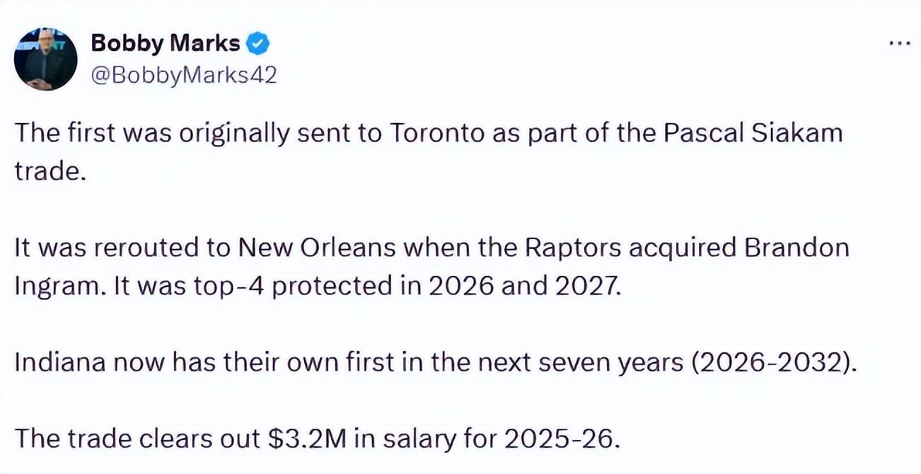 简单理解,步行者在这笔交易中选择将手中今年的23号签拱手让人,收回了此前作为西亚卡姆交易筹码送出的2026年首轮签。而这个签位原本在今年交易截止日前,被猛龙转手送到了鹈鹕名下,如今绕了一圈,再度完璧归赵。